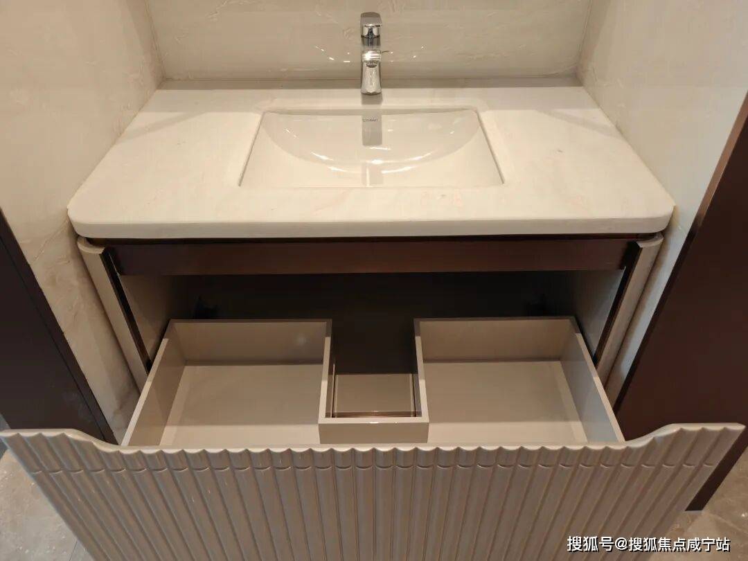 卫生间洗手台和柜体完满切割圆弧线,抽屉和水管贴合的处所贴心的做了凹槽,这既是对审美分歧的苛求,也贴心考量平安性。