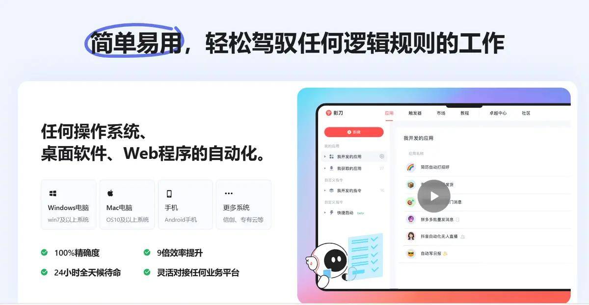 杭州分叉智能科技无限公司旗下 RPA 品牌,成立于 2019 年,创始团队来自头部科技公司,获浩繁出名投资机构青睐。影刀的焦点劣势是轻量摆设,下载即可利用,且具有丰硕的教程。特别擅长电商、跨境电商范畴。订单处置等工做为例,影刀的 RPA 产物能让电商从业者快速上手,高效完成工做。