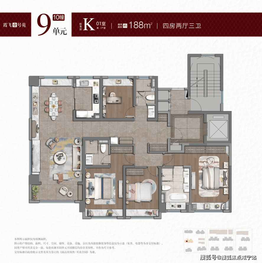 ,显得整个空间敞亮高雅。室内也有大量石材,好比卫生间墙面配角是南斯拉夫白,建面188㎡K户型从客卫洗台布景墙利用的是。