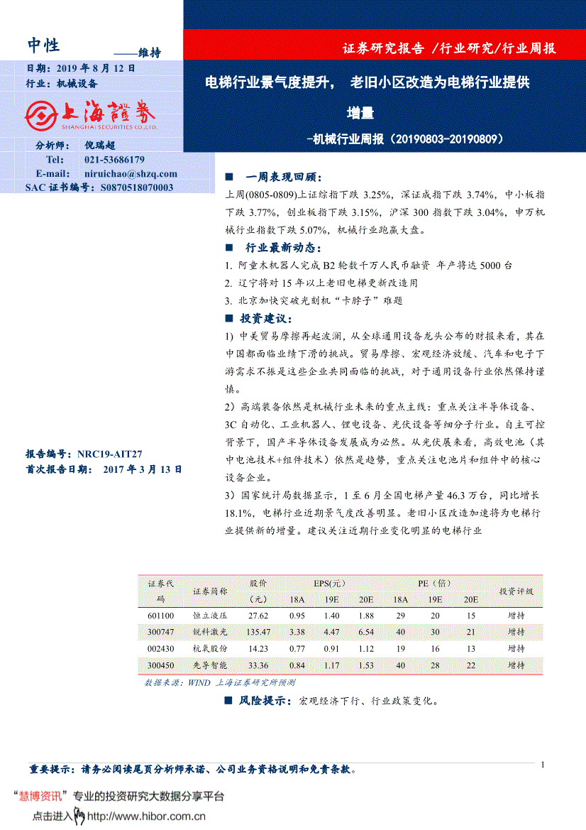 中性——维持日期:2019年8月12日行业:机械设备阐发师:倪瑞超Tel: E-mail: SAC证书编号:S03 演讲编号:NRC19-AIT27 初次演讲日期:2017年3月13日电梯行业景气宇提拔,老旧小区为电梯行业供给增量 -机械行业周报(2019) 证券研究演讲/行业研究/行业周报行业周报 2 2019年8月12日一、上周板块行情回首1、指数表示取板块估值上周(0805-0809)上证综指下跌3。25%,深证成指下跌3。74%,中小板指下跌3。77%,创业板指下跌3。15%,沪深300指数下跌3。04%,申万机械行业指数下跌5。07%,机械行业跑赢大盘。